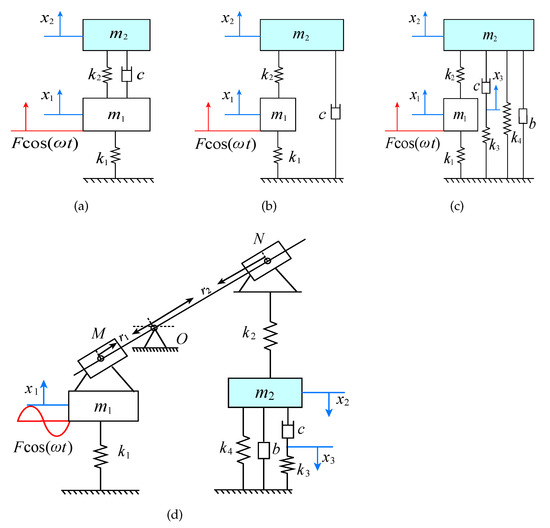 Lever mechanism can improve the effective quality of the systems. Flannelly [32] introduced the lever element and designed a new vibration isolator. Li et al. [33] proposed a lever-type multiple tuned mass dampers and used it to suppress bridge vibration, which showed stronger robustness. Liu et al. [34] proposed the lever-type vibration isolation system with the X-shaped structure, which had excellent vibration isolation performance. Zang et al. [35] designed a lever-type nonlinear energy sink. Under the proper pivot location, the absorption performance was superior to the traditional nonlinear energy sink. Cao et al. [36] introduced the lever-type nonlinear energy sink to a fluid-conveying pipe coupled system and found that the lever-type nonlinear energy sink could reduce the resonance response amplitude by . In the meantime, it was found in the literature [37,38,39,40] that some scholars worked on the performance of the DVA by introducing lever and other devices simultaneously. Yan et al. [37] introduced eddy current damping into a lever isolator. Shen et al. [38] studied a novel DVA with grounded stiffness and lever component and concluded that the control effect of the presented DVA with positive grounded stiffness was better. Shen et al. [39,40] designed two different types of DVA that simultaneously contained a lever, inerter, and grounded stiffness, and it was found that the system would be unstable if the inerter was inappropriate. Furthermore, the performance of the vibration absorber could be further improved by adding variable negative stiffness [41], a metamaterial component [42], or a distributed arrangement [43,44].