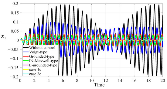 The harmonic force is applied to the primary system. The excitation amplitude is taken as , and the excitation frequency is taken as . Figure 13 presents the normalized displacement response of the primary structure equipped with DVAs and without control. The displacement response of the primary structure without inerter or lever vibration absorbers exhibits obvious fluctuation. By using the proposed vibration absorber, the large vibration of the primary system is alleviated.