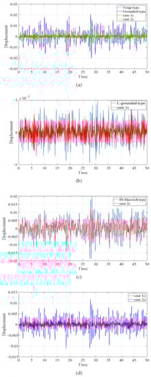From Figure 15 and Table 4, it can be seen that, when the primary system is subjected to random excitation, the proposed DVA, under two sets of optimal parameters, has lower amplitude than classical DVAs. Compared with the IN-Maxwell-type DVA, it is found that under the same initial conditions , the proposed model for case 2c has better control performance under random excitation, which indicates that the lever element plays a role in vibration absorption. Compared with the L-grounded-type DVA, the model proposed in this paper for case 1c has a better control performance under the same initial conditions , which indicates that the inerter plays a role in vibration absorption. Furthermore, when is in the range of 1 to 4, the proposed DVA has satisfactory reduction vibration effect, and the DVA has two positive grounded stiffness.