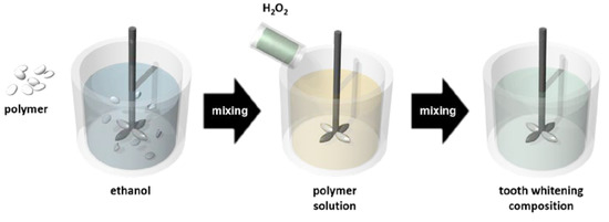 A non-erosive polymer (PVAc or EC, 20 g) was directly added to EtOH (72 g) and stirred at 25 °C for 3 h. Next, 35% H2O2 solution (8 g) was slowly added to this solution as a bleaching agent to prevent the aggregation of the polymer and H2O2. After sufficient mixing, the non-erosive tooth-whitening compositions PVAc-H2O2 and EC-H2O2 were obtained (Figure 1). The PVP-H2O2 tooth-whitening composition was also prepared similarly using PVP.