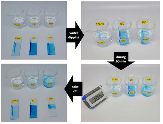 The prepared PVAc-H2O2, EC-H2O2, and PVP-H2O2 tooth-whitening compositions and the corresponding films coated on glass slides were colorless and homogeneous. Hence, to evaluate the water resistance of the PVAc-H2O2 and PVP-H2O2 tooth-whitening compositions, the test specimens dyed blue and coated on a glass slide were prepared, as described in the experimental section (Figure S1b). The PVP-H2O2 film, which contained the highly water-soluble PVP polymer, was washed off the glass slide (Figure 2). In contrast, the non-erosive PVAc-H2O2 and EC-H2O2 films showed very high retention, with no loss relative to their initial [23,24]. These results suggest that the non-erosive tooth-whitening compositions will not be washed away in the oral environment and will be retained for a long time.