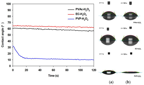 Contact angle plot and photo-images of PVAc-H2O2, EC-H2O2 and PVP-H2O2 compositions coated on slide glass; (a) initial, (b) after 120 s.