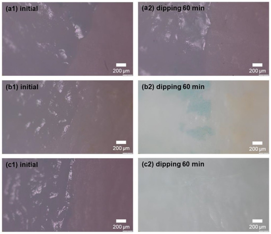 Digital optical microscopy images of initial and dipping 60 min of tooth whitening compositions coated on bovine teeth: (a) PVAc-H2O2, (b) EC-H2O2, and (c) PVP-H2O2.