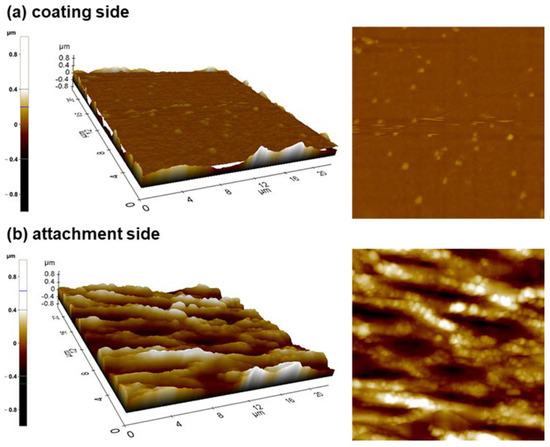 The AFM images revealed a smooth coating of PVAc-H2O2 on the bovine tooth surface (Figure 5a). After drying, a uniformly coated surface was obtained without any observable clumps or agglomeration. The parameters of average roughness (Ra) and root-mean-square roughness (Rq) of the coating side were 7 nm and 14 nm, respectively. The coating on the tooth was peeled off using a double-sided tape and observed by AFM to examine the surface of the tooth coating on the attachment. Unlike the coating on the tooth surface, the film of the tooth-whitening composition coated on the attachment side exhibited pseudo-isomorphic morphology with the bovine tooth surface. The Ra and Rq of the attachment side were 135 nm and 168 nm, respectively. The pristine bovine teeth surface exhibited Ra and Rq values of 123 nm and 154 nm, respectively (Figure S2). The obtained AFM images confirmed that the PVAc-H2O2 tooth-whitening composition coated on the surface of the bovine teeth retained its initial morphology (Figure 5b). Additionally, the coated film has specific surface morphology and excellent wettability and, hence, is expected to exhibit a significant tooth-whitening effect [30,31].