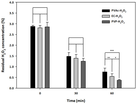Residual H2O2 concentration of PVAc-H2O2, EC-H2O2 and PVP-H2O2 tooth whitening compositions. (significant codes; *: p < 0.05, **: p < 0.01, ***: p < 0.001).