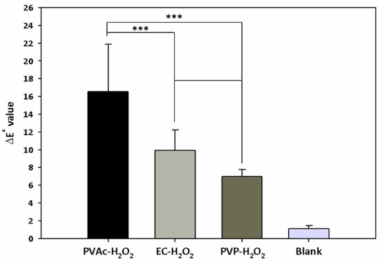 ΔE values of various polymeric tooth whitening compositions after 1 h of treatment (in vitro). (significance codes; ***: p < 0.001).
