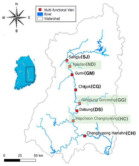 The Nakdong river water system, the target of this study, is composed of eight multifunctional weirs, which are the main water structures of the main stream. Changes have been made to the environment of the watershed with the installation of multifunctional weirs as part of a river project in 2012. Therefore, watershed management measures according to environmental changes are urgently needed. As the water depth of the Nakdong river has increased and the flow speed has decreased after the Daehacheon Project, its water has stagnated, and consequently, changes in water quality and environment have been observed. An algae warning is issued every year due to heat waves and droughts in summer, and on 22 August 2018, the number of harmful cyanobacterial cells per 1 mL of water in Hapcheon–Changnyeong Weir was recorded at 1,264,052, which is the worst case of algal bloom in history [19]. In the main stream of the Nakdong river, eight multifunctional weirs were installed as part of a river project: Sangju, Nakdan, Gumi, Chilgok, Gangjeong–Goryeong, Dalseong, Hapcheon–Changnyeong, and Changnyeong–Haman weirs, which are located from upstream to downstream. Figure 1 shows the location of the multifunctional weir installed in the Nakdong river. Among the eight weir structures, Nakdan, Gangjeong–Goryeong, and Hapcheon–Changnyeong weirs were selected as the target areas. Table 2 shows the multifunction weir specifications. After the construction of the weirs, the hydraulic residence time increased, the characteristics of the stagnant water area were observed, and problems with algae due to heat waves and drought continued to occur.