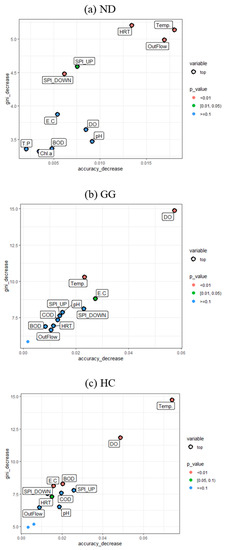 In this study, the main factors influencing the occurrence of blue-green algae in the target area were identified, and the importance of each variable was evaluated. Figure 2 show the graphs of Gini decrease, which is an important variable for improving node impurity when constructing a random forest, and accuracy decrease, which has a significant influence on increasing classification accuracy on the x- and y-axes. For the SPI, the value of the weather station upstream of the weir point is represented as SPI_UP, and the value of the weather station downstream of the weir point is classified as SPI_DOWN. Temp. is the abbreviation for temperature. The ND points appear in the order of HRT, temperature, and outflow. At point GG, the DO, temperature, and EC are important variables. The HC points appear in the following order: temperature, DO, and BOD.