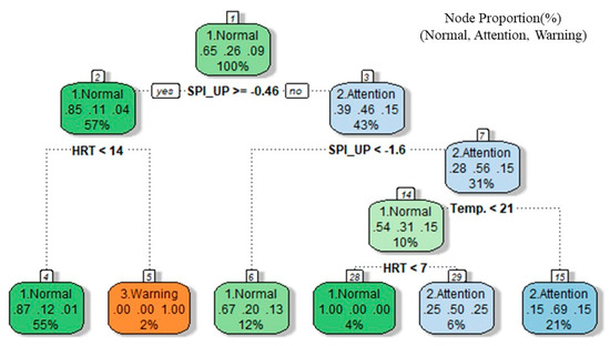 Among the total learning materials in the HC area, 46% are a normal grade, 25% are an attention grade, and 29% are a warning grade. The occurrence conditions classified as node 2 of the tree map account for 54% of the total learning materials. When the temperature is below 20 °C, the probability of being a normal grade is 68%. The occurrence conditions classified as node 26 are a temperature below 20 °C, an EC less than 347 μS/cm, an SPI_UP at −0.16 or more, and a BOD less than 2.4 mg/L; here, the probability of being an attention grade is 78%. In node No. 7, when the temperature is above 20 °C and the EC is above 347 μS/cm, the probability of becoming a warning grade is 96%.