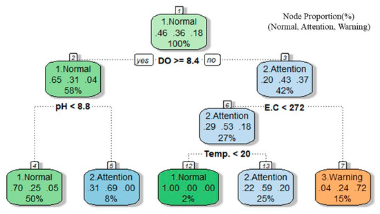 Figure 3, Figure 4 and Figure 5 graphically show the decision tree results. The purity of a node can be approximately checked by looking at its color. In addition, the ratio of each node to the total observation data is classified as the algal bloom warning system’s grade. The first line in the box represents the ratings of the classified algal bloom warning system. The second row shows the percentages by grade. A level of blue-green algae cell count less than 1000 cells/mL is in the normal grade; a level of 1000–10,000 cells/mL is in the attention grade; and a level of 10,000 cells/mL or more is in the warning grade. The bottom row shows the percentage of observations included in the nodes of the total data.