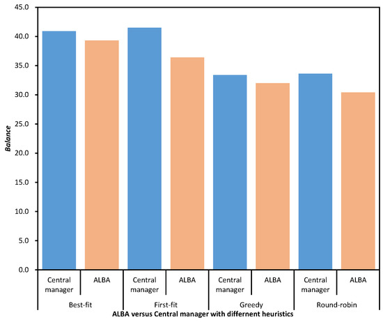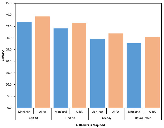 The effectiveness of ALBA and MapLoad were evaluated using the performance metric Balance, calculated as shown in Equation (4). A lower Balance value indicates a more evenly distributed computing resource usage across (possibly heterogeneous) hosts.