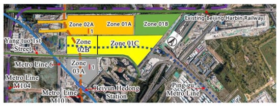 The Beijing City Vice Center Comprehensive Transportation Hub is a project that is located on Yangtuo Street, Tongzhou District, Beijing. It is a sizable transportation hub that integrates buses, private automobiles, urban railways, suburban railroads, and multi-level transportation. It is entirely underground. This thesis is based on Project 04 Section 02B Area. The excavation depth is 20.2–33.6 m below the ground surface (BGS), the pit length is approximately 234.66 m, and the width is about 136.16 mm. Since Yangtuo 1 Street above the transportation hub is an important traffic artery of the sub-center, it is necessary to complete the widening and transformation of the original Yangtuo 1 Street as soon as possible and form a traffic network with the surrounding roads, as shown in Figure 1.
