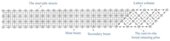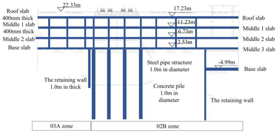 The physical and mechanical parameters of the pre-stressing anchor cable are shown in Table 2. The reinforced concrete diaphragm walls (D-walls) were 1 m thick, with a depth of 18.7 BGS; the pull-out resistant piles were 1 m in diameter and 28 m in length to prevent excessive heave deformation at the bottom of the pit during excavation. The thickness of the roof slab was 400 mm. The thickness of the middle slab 1 was 400 mm. The bored retaining piles, cast in situ, are 2 m in diameter and 43~48 m in length; the steel pipe structs are 1~1.1 m in diameter, 9 m in spacing, 0.02~0.04 m in wall thickness, and 18.75 m~27.847 m in length; and the beams are of the “well”-type structure, the cross-sectional size of the main beam is 0.9 × 1.6 m, and the size of the secondary beam is 0.4 × 1.4 m; see Figure 4. Among them, Areas A and B share the reinforced concrete diaphragm walls (D-walls), and Area C is excavated by the multi-stage slope. The physical and mechanical parameters of the soil nails are shown in Table 2.