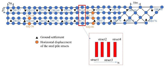 In order to obtain the excavation-induced deformation data of the steel pipe structs in time, we master the deformation characteristics of the steel pipe column. Twenty surface (DB) vertical deformation monitoring points were firstly selected in the road surface of Area B, as shown in Figure 5, numbered as DB157–DB176. The steel pipe column in Area B is the main vertical bearing structure, and it has strict requirements for horizontal deformation as an axially pressurized structure. Excessive differential deformation results in the additional bending moment or eccentric load on the steel pile structs. According to the relevant specification of the “Technical specification for the retaining and protecting of building foundation excavation” (DB11/489-2016), the safety level of the pit side wall in this area is level 1. The structural deformation should meet the following provisions: the maximum horizontal displacement control value of the support structure is 0.1% H; the specified value of the vertical deformation of the steel pipe column structure is 10 mm; the vertical differential settlement is 10 mm; and the maximum horizontal deformation allowed is 8 mm.