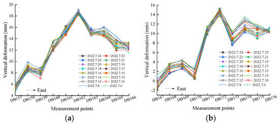 Figure 6 shows the vertical displacement of the pavement monitoring points in Area B during the excavation of soil above 13.5 m BGS in Areas A and C. The surface deformation trends of the south and north sides of Area B are the same, both showing a typical bulging-type profile. The maximum vertical deformation of 16 mm on the south side and 20 mm on the north side is mainly due to the rebound of the excavation, and excavation in Area C is faster than in Area A. In addition, it can also be seen that the east side of the B area’s vertical deformation is much larger than the west side, mainly because the steel pipe structs of the west side arrangement is regular, with a spacing of only 9 m, and the steel pipe structs of the east side spacing is larger, about 18 m; the steel pipe column arrangement shape is irregular; the steel pipe structs’ spacing is different so that the excavation-induced stress release on the steel pipe structs’ impact of the east side is larger than the west side.