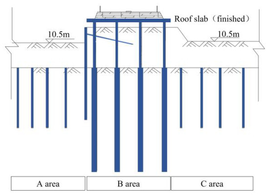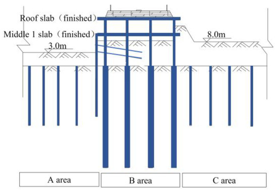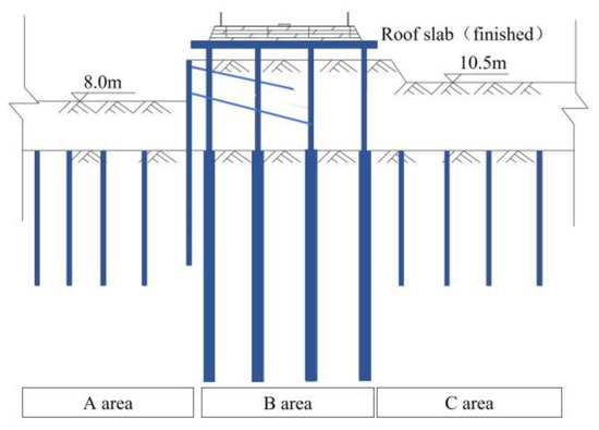 Case 4: The middle 1 slab of Area B was applied, and the excavation of Area A and C was staggered, as shown in Figure 10; Area A and C were excavated to 10.5 m BGS first, and the middle 1 slab in Zone B cast; then, Area A and C were excavated to 8.0 m BGS and 10.5 m BGS, respectively, and the excavation was staggered until completion.