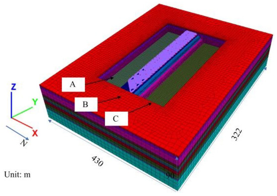 In order to study the influence of the construction of Area A and C on the steel pipe structs in Area B, this paper uses the FLAC3D finite difference method (FDM) to simulate the construction process. Based on the actual size of the structure and in order to avoid the boundary effects of the computational model, the model size is 430 m (X-direction) × 322 m (Y-direction) × 90 m (Z-direction), with total zones of 406,874. The soil is simulated with the zone; the support structures such as beams, columns, and pile supports are simulated with the beam; and the D-walls are simulated with the plate. The concrete structure is simulated with elastic, and the soil is simulated with the Plastic-Hardening (PH) constitutive model, as shown in Figure 11.