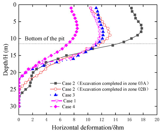 Figure 12 shows the relationship between the maximum disturbance δhm of the D-walls and the excavation depth H under different cases. Among them, the maximum lateral deformation of the D-walls in Cases 1, 2, 3, and 4 are 17.8 mm, 12.2 mm, 11.8 mm, and 8.5 mm, and the maximum deformation values are less than the control values. Because the construction of the anchor needs to be completed after the excavation of each layer of the foundation pit, the D-walls are in an unsupported condition; thus, the cantilever deformation occurs on the top of the D-walls [14,26]; The stress redistribution caused by soil unloading causes the deformation of the diaphragm wall above the pit bottom towards the excavation side. The maximum horizontal deformation of the D-walls occurred near the bottom of the pit, which is consistent with the results of Li [27]. At the same time, it shows that this constitutive model can better reflect the complex soil–structure interaction during the excavation of the pit.