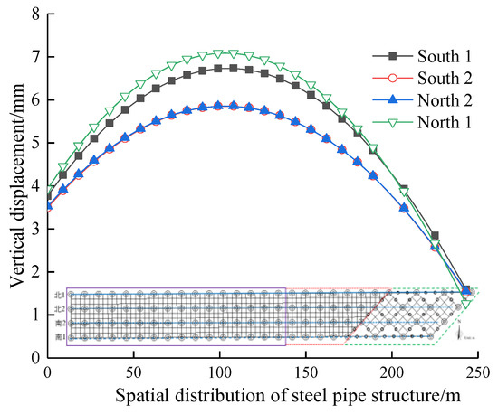 The spatial effect of the pit excavation causes different deformation at the bottom of the pit, which leads to different vertical deformation of the structure at different locations. Figure 13 shows the maximum vertical deformation of the steel pile structs in Area B. The vertical deformation of the steel pile structs in Area B (east–west direction) shows a “convex” trend of the large in the middle and small on both sides; it is mainly because the vertical deformation of the soil around the pit is much smaller than that in the pit, due to the mutual restraint effect of the soil around the pit. The vertical deformation of the steel pile structs shows that South 1, North 1 > South 2, North 2, with the maximum value of 6.7 mm, and the vertical deformation of the steel pipe column meets the design requirements; the unloading of soil in Areas A and C causes the rebound of the pit bottom, and the vertical deformation of the steel pipe column adjacent to the excavation side increases due to the mutual friction of the soil−structure interaction.