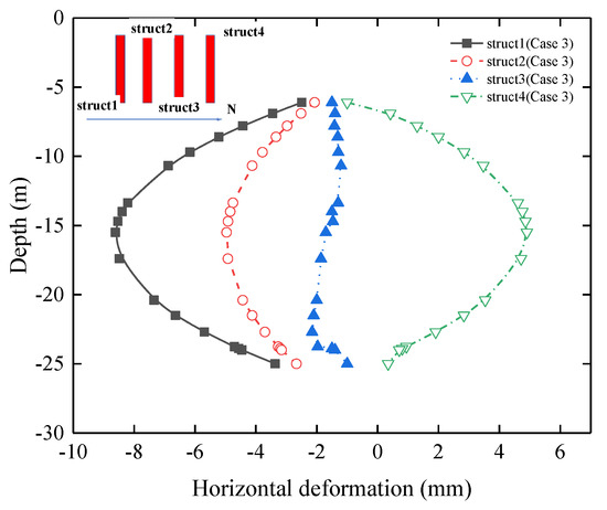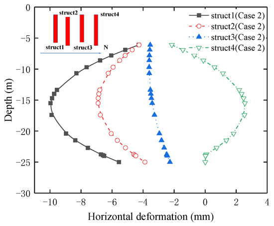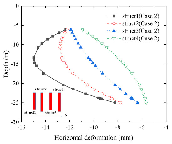 The horizontal deformation of the steel pipe structs is mainly caused by the redistribution of soil stress caused by the excavation of the foundation pit. Figure 14 shows the horizontal deformation of the steel pipe structs under the condition of Case 1. The deformation trends of the steel pipe structs (Struct 1, Struct 2, and Struct 4) immediately adjacent to the excavation side are the same, and they show a convex deformation to the excavation side, respectively; and Struct 1, Struct 2, and Struct 3 show deformation to the south side, while Struct 4 shows deformation to the north side. The maximum horizontal deformation values of the steel pipe Struct 1 and Struct 4 are 8.25 mm and 5.8 mm, respectively. The main reason is that the distance of the steel pipe structs from the pit edge is different. Struct 1, Struct 2, and Struct 3 are 3 m, 12 m, and 21 m from the common D-walls, while Struct 3 and Struct 4 are 24 m and 15 m from the pit in Area C. The excavation of Area C is using the slope-cut method, and the soil behind the slope limits the horizontal deformation of Struct 4. In addition, the distance of Struct 3 from the pit edge is larger, and the soil-stress redistribution has less influence on Struct 3. It can be seen that the excavation of the pit on both sides has a more obvious influence on the steel pipe structs on the adjacent excavation side, and the distance from the pit edge is the key factor affecting the deformation of the structure.