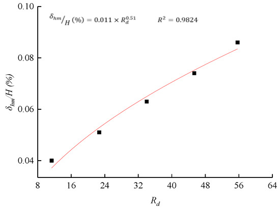 Figure 19 shows the relationship between the maximum lateral deformation δhm/He and the relative stiffness coefficient Rd according to the above four excavation cases, where the maximum lateral deformation δhm is normalized to the excavation depth He, in order to value the relative stiffness magnitude required for the structure through the maximum control deformation, and thus to carry out a more reasonable structural design. Fitting δhm/He with Rd, the optimal stiffness required for the main structure is calculated through the structural deformation values specified in the design code, which can provide a reference for the designer in the design of the supporting structs.