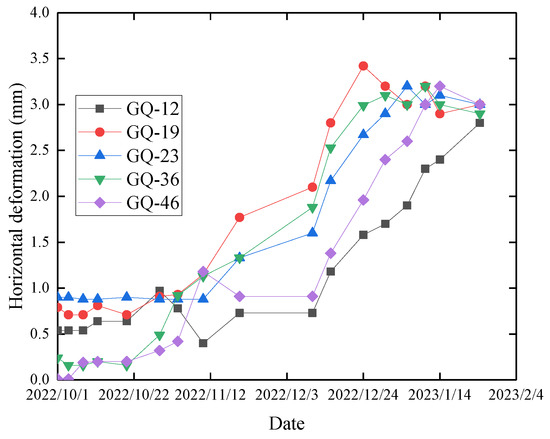 According to the above simulation results, the parallel pit excavation is constructed by Case 4, and the pit on both sides of the middle 1 slab cast and the Areas A and C are excavated in staggered steps. The following monitoring data reflect the horizontal deformation curve of the steel pipe structs above the middle 1 slab when the construction of Case 4 is adopted, as shown in Figure 20.