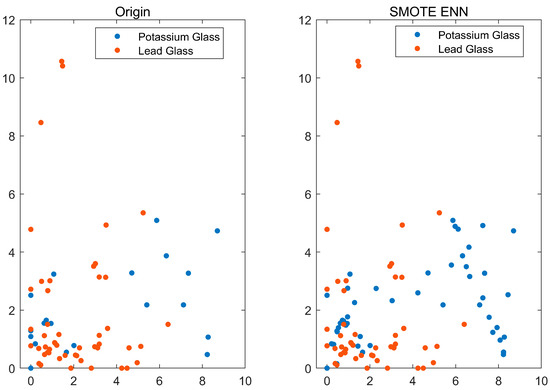 In this article, we use a combination of the two methods of SMOTE and ENN to equalise the data. First, a small number of classes of samples are oversampled using the SMOTE algorithm [29,30], and then the data are undersampled using the ENN method. In this way, we are able to obtain a balanced set of samples, which in turn improves the performance of the classifier. After processing by the SMOTE+ENN algorithm, a total of 98 sets of data were obtained in this study, including 49 sets each for potassium glass and lead glass. Figure 2 shows the scatter plot before and after SMOTE+ENN processing.