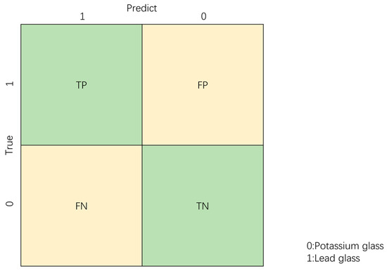 Confusion Matrix. TP (True Positive): correct prediction for lead glass; TN (True Negative): correct prediction for potassium glass; FP (False Positive): incorrect prediction for lead glass; and FN (False Negative): incorrect prediction for potassium glass.
