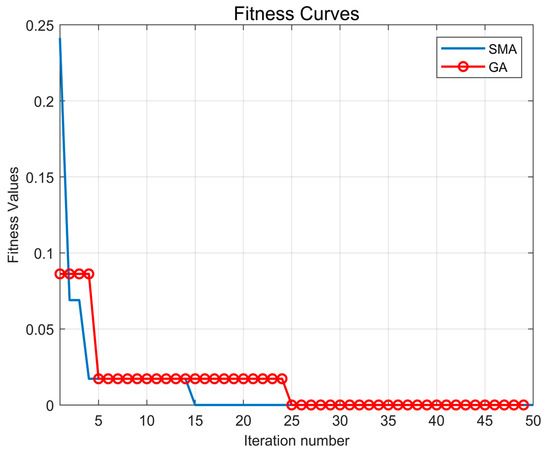In the GA algorithm and SMA algorithm, fitness is an indicator to evaluate the strengths and weaknesses of an individual. During the iteration of the algorithm, the fitness value of an individual changes when the population evolves, resulting in a fitness curve. The fitness value is calculated as Equation (14).