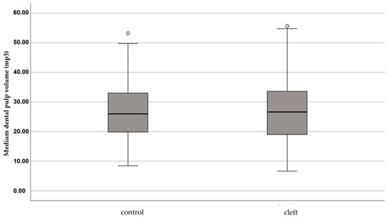 Diagram of extremes and quartiles shows the value distribution of the medium pulpal volume for both the control and CLP groups.