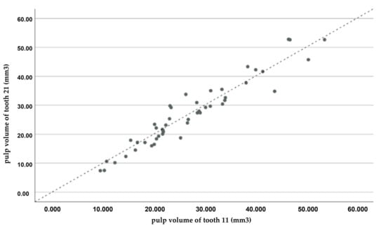 The pulpal volume comparison between teeth 11 and 21 (paired groups) was performed using the student’s t-test for paired samples or the Wilcoxon test according to the verification of the normality assumption. The accordance of the pulpal volumes was performed by the intraclass correlation coefficient and by visual inspection of the scatter plot of the variables in question and its comparison with the direct proportionality y = x.