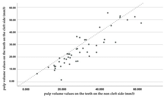 It can be observed in Figure 3 that the points are in proximity with the line, which translates into an accordance between the pulp volumes of the teeth on both sides. This concordance is corroborated by the intraclass correlation coefficient that has a value of 0.977 (p < 0.001). In Figure 4, on the other hand, it is possible to observe that the points are more distant of the line, and that the teeth on the cleft side present a lower pulpal volume. The concordance between the volume values and the intraclass correlation coefficient is very strong, presenting a value of 0.917 (p < 0.001).