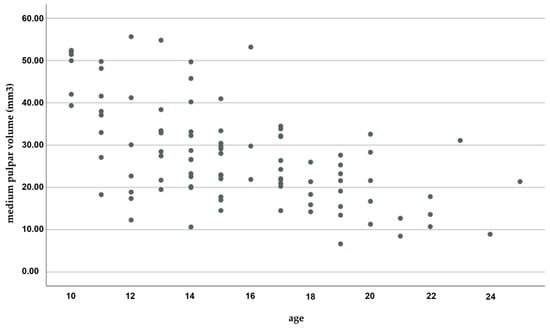 A statistically significant linear regression can be observed (p < 0.001) between the medium pulpal volume and age, with age explaining approximately 32% of the pulpal volume variance. Age represents a regression coefficient of −1.919, which means that for each additional year a medium decrease of 1.919 mm3 in pulpal volume is observed. The dispersion graph shows the relationship between age and medium pulpal volume (Figure 5).