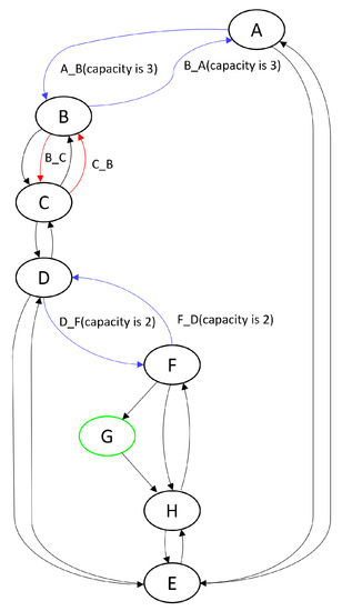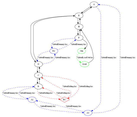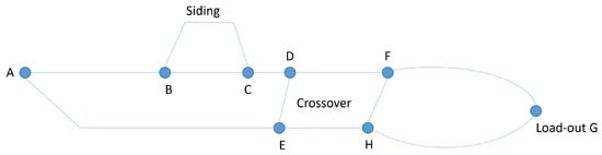- For each load-out in , we replace it with two separate node (entry node) and (exit node), and add a load-out link (, ) into W. Let be the set of load-out links. By splitting the entry and exit point nodes for each load-out, we ensure that trains are staying at load-out for the required loading time. At the same time, we replace the related inbound links to and the related outbound links to . Accordingly, we have , , and , where indicates the required loading time.
