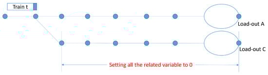 - Initializing variables only for arcs on which train will travel: for each train, we only consider the reasonable arcs according to its destination. For example, in Figure 3 the train t is heading for load-out A. We then can set all the unreasonable variables (i.e., those variables associated to the arcs heading for load-out C) to 0.