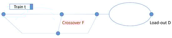 We define a physical network with a set of nodes S and a set of links W. The set S consists of switch stations (), and load-outs () in the physical network. is the set of links in physical network, where stands for link connecting node to node . The set W consists of mainline tracks (), siding tracks () and crossovers () in the physical network. For each link , let