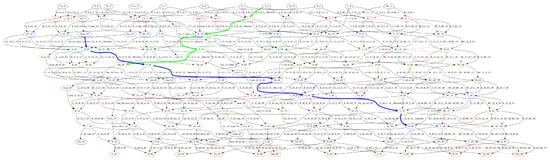 We have two trains to schedule in Table 4, where train Mtest01 goes toward load-out G and train Mtest02 returns from load-out G. We are able to get the solution in less than one minute, where the train schedule for train Mtest01/Mtest02 is demonstrated via green-path/blue-path, respectively, in Figure 9.