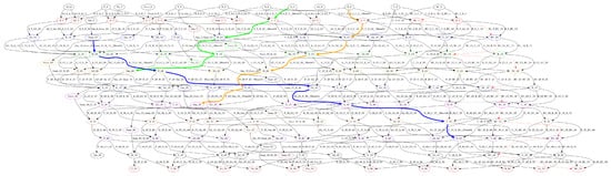 Given the three sets of trains information in Table 7, both train Mtest01 and Mtest03 go toward load-out G with the same start station; train Mtest02 goes back from load-out G with departure time constraint. Similar to case 3, we are able to get the solution in less than one minute, and demonstrate the train schedule in Figure 11, where the schedules for trains Mtest01, Mtest02, and Mtest03 are shown via the green path, blue-path, and orange path, respectively. The detailed train schedules are listed in Table 8.