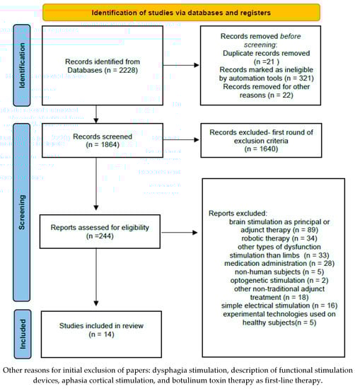 Secondary exclusion criteria included: (a) brain stimulation as a principal or adjunctive therapy, (b) other types of non-limb-dysfunction stimulation (e.g., dysphagia), (c) administration of drugs (e.g., botulinum toxin), (d) non-human subjects, (e) optogenetic stimulation, (f) other non-traditional adjunctive treatment (e.g., stem cells), (g) simple electrical stimulation (without functional training), and (h) new experimental technologies used on healthy subjects.