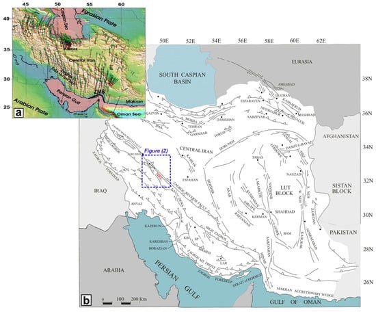 The Zagros mountain range in southwest Iran (Figure 1a) expanded from ~250 km to ~400 km in width and ~1500 km in length from SE Turkey (in the west) to the Hormuz Strait (in the east) (Figure 1). This range was formed in a series of tectonic events related to the collision of the Arabian plate with the Eurasia plate in the Miocene [,]. The Main Zagros Reverse Fault (MZRF) and MRF delineate the Arabia–Eurasia suture that limits the northern extension of the Zagros range (Figure 3) [].