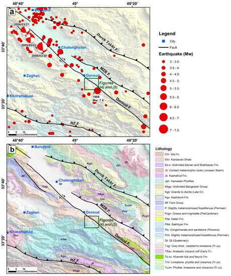 The sources of earthquakes catalogue and geological map: (a) seismotectonic map of northeastern Lorestan; (b) northeastern Lorestan geology map overlaid on a shaded relief map of the 10 m digital elevation model with active fault traces resulting from the Landsat images and field observations.