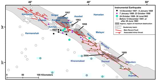 The multisegmented Zagros Main Recent fault is a major NW–SE-trending right-lateral strike–slip seismic fault zone of more than 800 km long located between the Zagros fold-and-thrust belt in the southwest and Central Iranian range-and-basin in the northeast [,,]. The fault trace in the northern margin of the Zagros range depicted by Ambraseys and Melville [] is equivalent to what is now known as the MRF, but there was no field evidence for the strike–slip component; only vertical displacements were observed (north-east side down). The MRF is divided into five major segments (from Kamyaran to Arjanak), including the Doroud, Nahavand, Garun, Sahneh, and Morvarid segments [] (Figure 3). In the last century, several destructive earthquakes, such as Silakhorin 1909.01.23 with Mw7.3; Razan 1955.12.04, UTC: 14:02, epicenter: 33.50 N–48.80 E Ms 6.0; Heydarabad 1961.10.28, UTC: 10:46:33.54 N–48.49 E and Ms 5.0; Sahneh 1958.08.14, UTC: 15:26 and Ms 5.5; Nahavand 1958.08.16, Mw 6.6, UTC: 19:13 and epicenter: 34.25 N–47.84 E; Dinevar 1958.09.21, UTC: 16:18 and Mw 5.2; 1987.05.29, epicenter: 34.06 N–48.28 E, Ms 6.5 and Night/Wednesday; Farsineh 1957.12.13 with Mw 6.5; Nevahand 1958.08.16 with Mw = 6.7; Karkhaneh 1963.03.24, UTC: 12:44, epicenter: 34.43 N–47.89 E and Mw 5.8; and Chalencholan 2006.03.31 with Mw = 6.1, have occurred on these segments (Figure 3) []. The most destructive was the 1909 earthquake (Ms 7.4) associated with a fault rupture over 45 km long []. It was felt in a large area where 128 villages were damaged and it caused more than 8000 people to be killed [,].