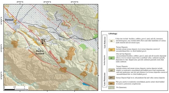 To determine the slip rate of the Doroud Fault, the offsets of tectonic features were analysed using field observations, topographic data, Google Earth satellite images, and OSL dating results [,,]. The topographic data were obtained using real-time kinematic measurements (RTK). Given that the horizontal uncertainties for RTK data is <0.5 m, measurement errors on the displacements mainly arise from the determination of markers and construction of fitting lines [,]. We thus chose potential research sites based on the interpretation of a digital elevation model (DEM) and Google Earth satellite images; moreover, before digging trenches, Holocene and Pleistocene rock units were carefully separated, the fault trace and surface geomorphic features around the fault were mapped in the field, and topographic cross-sections from RTK data were drawn (using The Environment for Visualizing Images (ENVI)) software across the fault scarps at the site. To study paleoseismology, we excavated a trench (see its location in Figure 4; TC (Trench)) using both hand and machine tools across the fault scarp and pond, and mainly along the middle segment of the Doroud Fault. We chose the pond to excavate a trench because it is a location of accumulation of recent sediments that certainly record seismic events, and this pond was formed due to the action of the fault in the hanging wall of the Doroud Fault and is the closest location to the epicenter of the 1909 earthquake. A string grid defining 1 m × 1 m panels was strung along the length of the trench walls after the walls were scraped and cleaned. Then, each grid panel was photographed with four images that slightly overlapped with one another. The sedimentary layers in each trench were classified as separate units based on color, particle size, sorting, texture, bedding thickness, and other characteristics, such as the colluvium wedge. The sequence of ground-rupturing events was then determined based on strata cross-cutting relationships, sediment thickness variations, soft sediment deformation, and fissures. The radiocarbon (C14) and optically stimulated luminescence (OSL) ages of sediment samples collected from trenches were utilized to constrain the ages of the stratigraphic units and, consequently, the interpreted events.