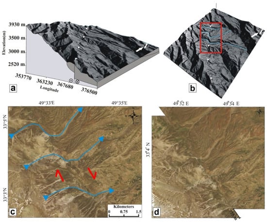 Offset reconstruction and morpho-structural interpretation: (a) The 3D perspective diagram (vertical exaggeration = 2) of the SE area (see Figure 2 for the location). Digital elevation model extracted from Aster 15 m. In this area, the Doroud Fault trace located between Quaternary alluvial and Pliocene piedmont deposits. (b) The present-day situation with three drainages and fault. The red box indicates the location of the (c). (c) Google Earth image of the right-lateral horizontal offsets of three rivers. The blue and red arrows indicate the rivers and right-lateral fault mechanism, respectively. (d) Reconstruction of the rivers to their initial position after back-slip the fault on the SASPlanet image of ~775 m of the rivers (1 and 2) offsets along the fault trace.
