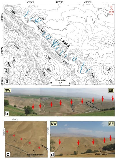 The use of morphological offsets to determine the long-term slip rate on an active fault requires datable morphologic features, which were first displaced by the fault motions and then preserved over the observable displacement [,,]. We used the satellite image of the satellite interpretations of the digital elevation model (DEM) at 10 m, SASPlanet satellite images (http://www.sasgis.ru), and the field observations by reconstructing the satellite image and measuring in the field; we came to the conclusion that the Doroud Fault has caused the maximum cumulative horizontal (dextral) offsets in the Pliocene–Quaternary units of the rivers by ~775 m and ~30 m (Figure 5 and Figure 6). The observed displacements are associated with the southeastern and middle segments of the Doroud Fault, which ruptured during the 1909 Silakhor earthquake [,,,]. Geomorphic evidence, such as dextral surface ruptures including beheaded gullies (Figure 6c) and shutter ridges (Figure 6d), is visible within the mezoseismal area of the 1909 earthquake, which demonstrates the fault zone in this region (Figure 6 and Figure 7) and its relationship to the late Pleistocene–Holocene activity of the Doroud Fault. However, the surface expression of the strike–slip fault is poorly exposed in the study area, with only a few possible nominations. These offsets, ranging from several meters to a kilometer, are observed from southeast to northwest.