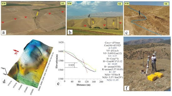 The detailed topographic and field photographs of the geomorphic features along the Doroud Fault: (a,b) Field photographs of the gullies S1, S2, and S3 (about them, read the text). The red triangles indicate fault trace. The yellow arrows indicate the location of the gullies. (c) Field photograph of the ideal gully offset along the Doroud Fault to determine fault slip rate and OSL sampling site (using GPS (RTK) surveying). The blue line indicates river. (d) The 3-D view of the digital elevation model (DEM) obtained from the GPS kinematics survey (red arrows are the fault trace, and green and yellow lines are shifted crest lines within the hanging wall and the footwall, respectively). (e) The diagram for the calculation of the slip rate of the Doroud Fault. Vertical profiles along the offset crests’ axes, with estimates of the cumulated vertical component, are shown on the diagram. The minimum value corresponds to the difference in height between the highest points in the violet footwall profiles and the lowest points in the orange hanging wall profiles. The maximum value corresponds to the vertical separations between the projections of the footwall and hanging wall profiles on the fault (consider a fault plane with a dip of 72°). Diagram defining the parameters for the calculation of the rake (R) of the slop. In order to calculate (c): H = horizontal component; V = vertical component; Vf = vertical component projected along the fault; α = dip of the fault plane (Cos c^ = d/v, c^ + p^ + b^ + 90° = 180°, b^ = 90° − c^ − p^, Vf = d/cos b^, R^ = arctgVf/H, h = cosp^xVf; α = arctg h/H). (f) Our RTK GPS systems provide digital elevation model (DEM), map, and fault slip rate.