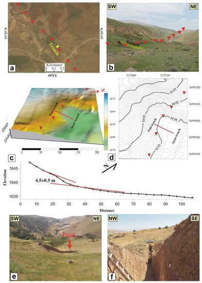 Previous studies related to the analysis of the seismic activity of the Doroud Fault have been carried out to investigate the pre-shocks and aftershocks of the two major earthquakes in 1909 (Ms 7.4) and 2006 (Ms 6.1) using Coulomb stress and InSAR data []. Investigating the fault ruptures and seismic gaps in the northern part of the fault [] indicates the fault has the ability to have a magnitude 7.1 earthquake. Therefore, the Doroud plain (or Silakhor plain) is considered to be highly active in the duration of tectonic activity, according to seismic catalog data [,,]. To retrieve the chronology of surface-rupturing paleoearthquakes, we conducted the first paleoseismological study along the Doroud Fault at a site called Darbe-Astaneh (Figure 4 and Figure 9). This site was selected based on geomorphological observations performed from a 3-D model obtained from the GPS (RTK) surveying and field surveys (Figure 9). The trench was excavated perpendicular to the general trend of the fault (Figure 9a,b), where our DEM map and topography profile show a fault scarp (Figure 9c–e).