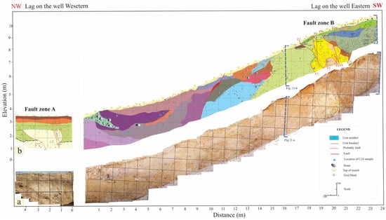Interpretive sketch and (a) a general orthophoto mosaic of the west and east walls, originally rendered at 1 mm resolution; (b) a detailed paleoseismic log of the wall of fault zone A and B.