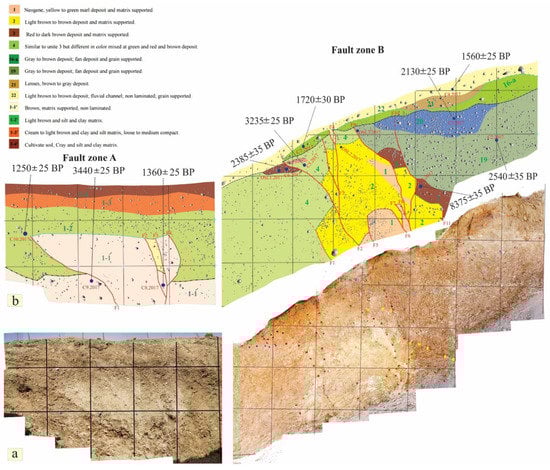 The recognition of a second paleoearthquake is located in Log fault zone A, a fissure fill localized at the base of units 1-2′, and shows the occurrence of an earthquake before the deposition of units 1-2′ (Figure 13c,d). This event is well-characterized by two faults F2′ and F3′, which are younger than 1360 ± 35 BP, which is the age obtained for sample DT1-C9 collected in unit 1-1′; therefore, this event postdates 1360 ± 35 BP and predates 3440 ± 25 Cal BP. The event horizon of this event is the base unit 1-2′ (Figure 15a,b); the earthquake magnitude of this event and other parameters related to the seismic activity of the fault is similar to the event Ev1′, which is given in Figure 10.