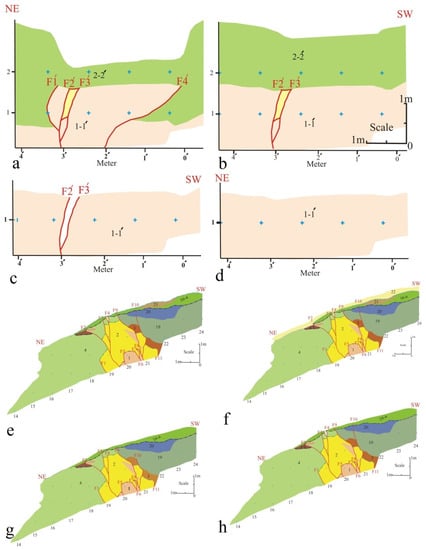 The back stripping scenario on the eastern wall of the trench (TC). The scenario confirms the seismic deformation of the events Ev1 to Ev4 by Doroud Fault activity. The red lines are faults. (a) Pre-event 1 and the after-deposit unit 2′. (b) Post-event 1 associated with cutting unit 2. (c) Pre-event 2. (d) Post-event 2 is associate with fissure-filled unit. (e) Pre-event 3. (f) Post-event 3 possibility associated with cutting unit 23. (g) Pre-event 4. (h) Post-event 4 associated with fissure-filled unit 23.
